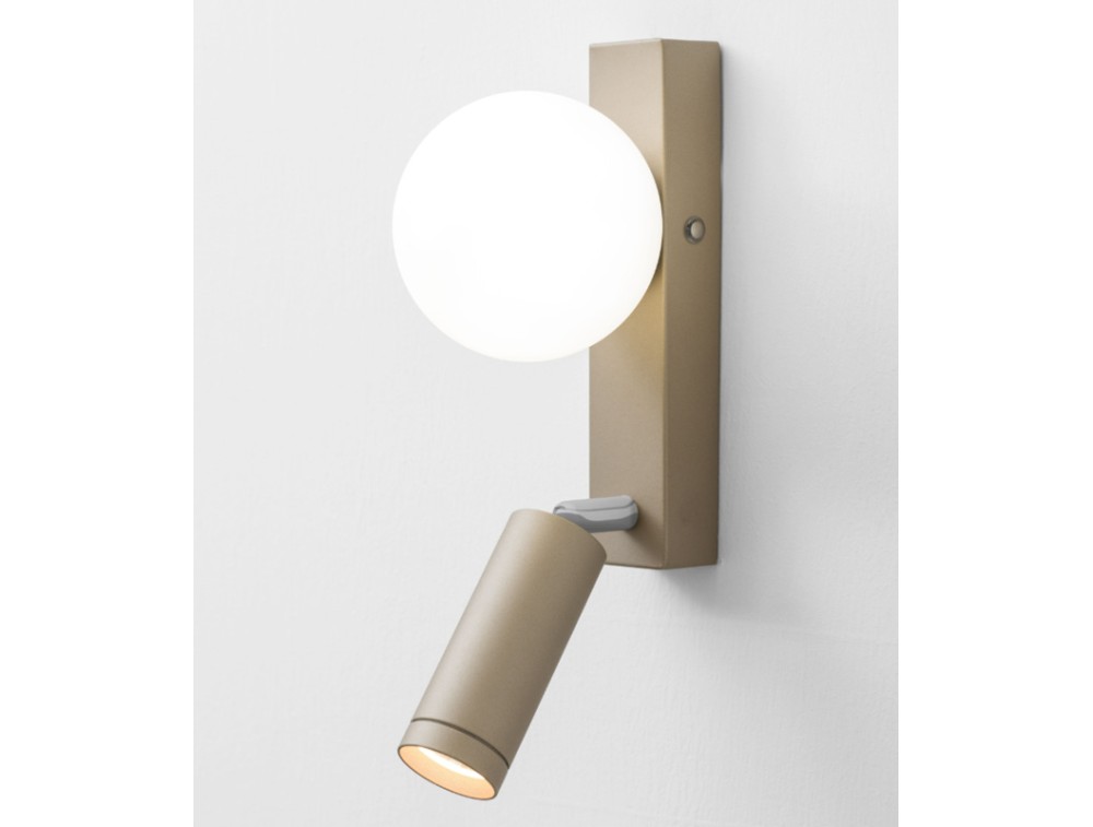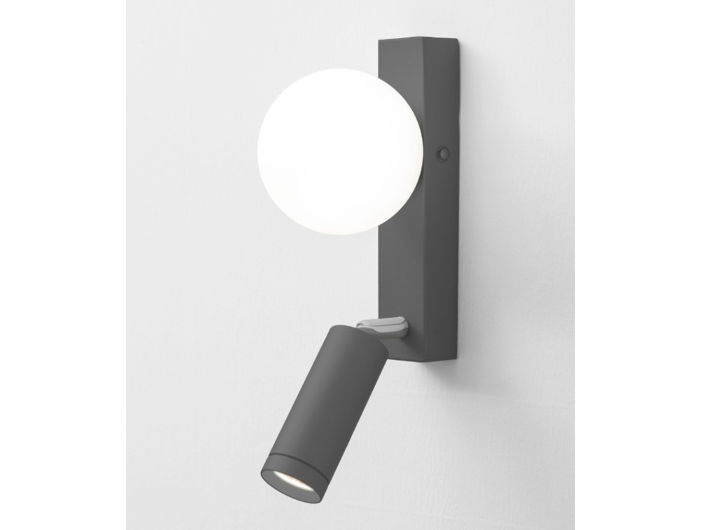 Wall light with integrated 3000K LED spotlight and G9 sphere (max. 6W bulb). Iron body and glass sphere-shaped diffuser. Available in various finishes, including anthracite and sand. The G9 light source is completely independent from the integrated LED spotlight: it can be turned on or off separately using the convenient side button, allowing you to control the two light sources independently and individually. It embodies a minimalist and contemporary style, focusing on clean geometry and the contrast between rigid lines and soft shapes. Thanks to the opal glass, the light is emitted uniformly 360 degrees around each sphere.