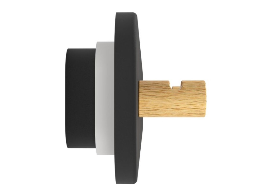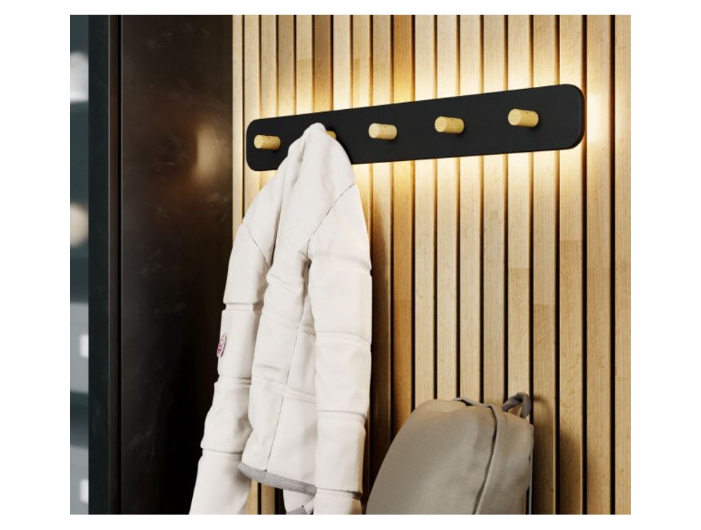 Featuring a black, rectangular metal body with rounded corners, the five brown ficus wood shelves offer plenty of space for jackets and coats, allowing it to be used as an illuminated wardrobe. The integrated LED, which surrounds the lamp body, provides pleasantly warm white light, creating indirect illumination in the entryway. This minimalist lamp blends in with modern decor styles and can be conveniently turned on and off via a switch integrated into the cable.