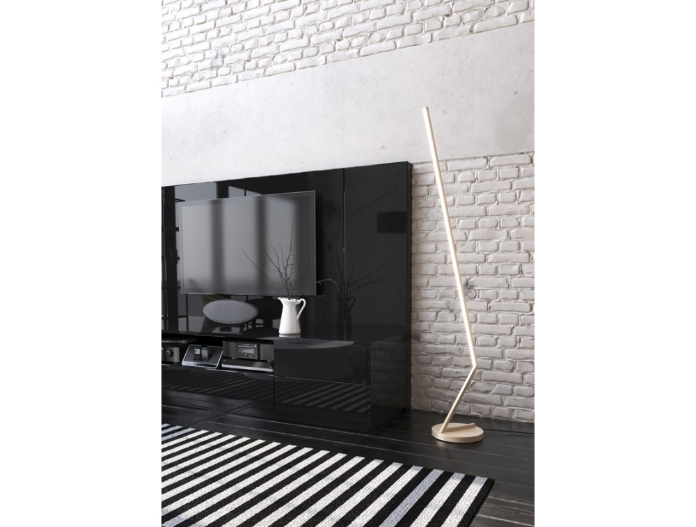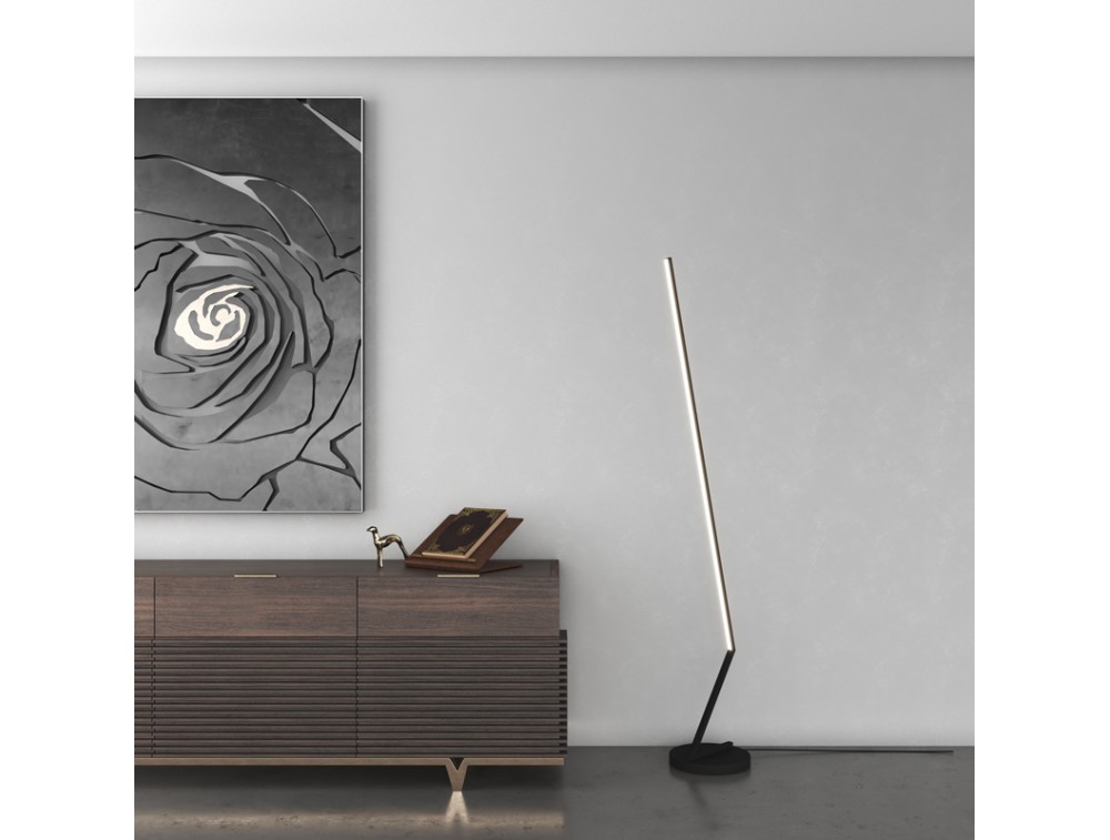 Lampada da terra a led integrato dal design moderno ed accattivante, disponibile nelle finiture verniciate nero ed oro champagne. E’ dotata di pulsante con funzione memoria, che consente di regolare in modo progressivo la temperatura di colore della luce tra 3000°K e 4000°K e di effettuarne la dimmerazione STEP (100% / 50% / 7%). Per cucina, salotto e camera da letto