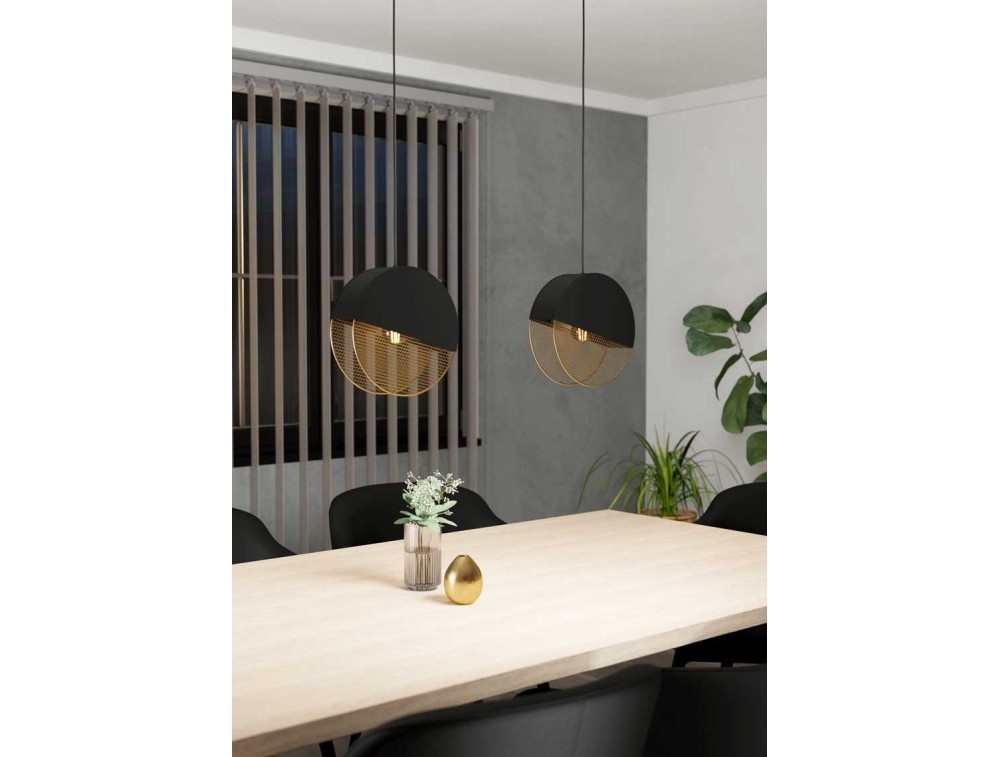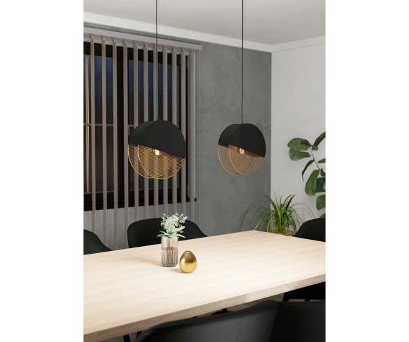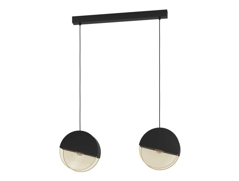 La lampada a sospensione MUMBLES è costituita da due paralumi circolari, composti per metà da un reticolo dorato e per metà da metallo nero. Il reticolo crea affascinanti giochi di luci e ombre.