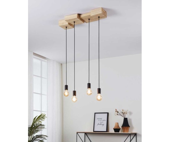 La lampada a sospensione HALKIN è composta da quattro parallelepipedi in legno di colore naturale, ognuno ha un porta lampadina sospeso tramite un cavo nero.