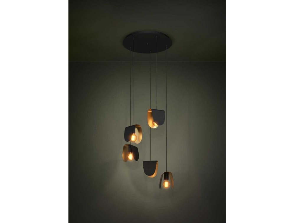 Lampadario moderno ideale per una camera da letto o un soggiorno, struttura in acciaio nero ed oro