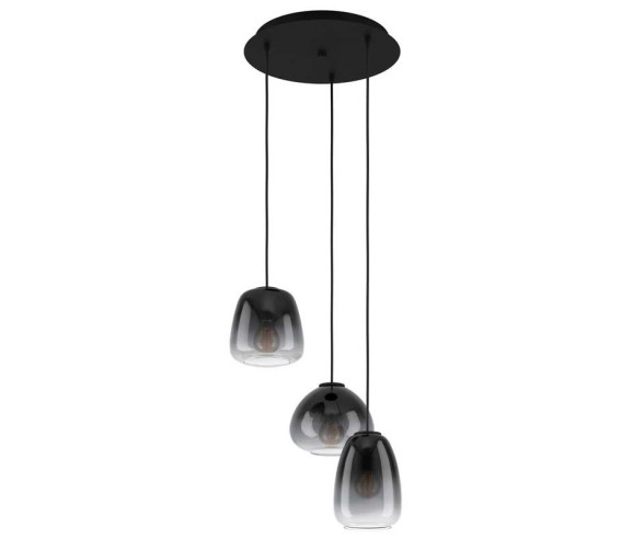 La lampada a sospensione AGUILARES è composta da tre diversi paralumi pendenti in vetro con delicate smussature. La sfumatura di colore in nero trasparente e i cavi neri di stoffa ad altezze differenti dalla struttura ovale in metallo nero completano abilmente il look elegante della lampada.