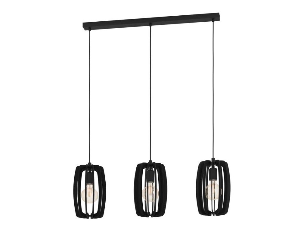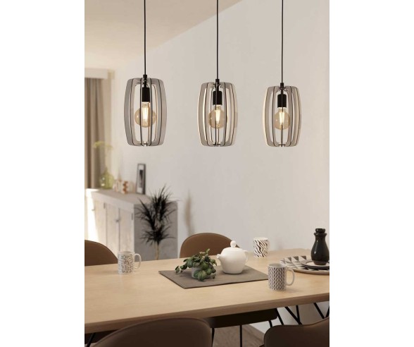 Lampadario realizzato in legno nero o grigio, disponibile ad una luce per ambienti di piccole dimensioni o a 3 luci per cucine o soggiorni di medie dimensioni. Struttura a soffitto in acciaio nero.