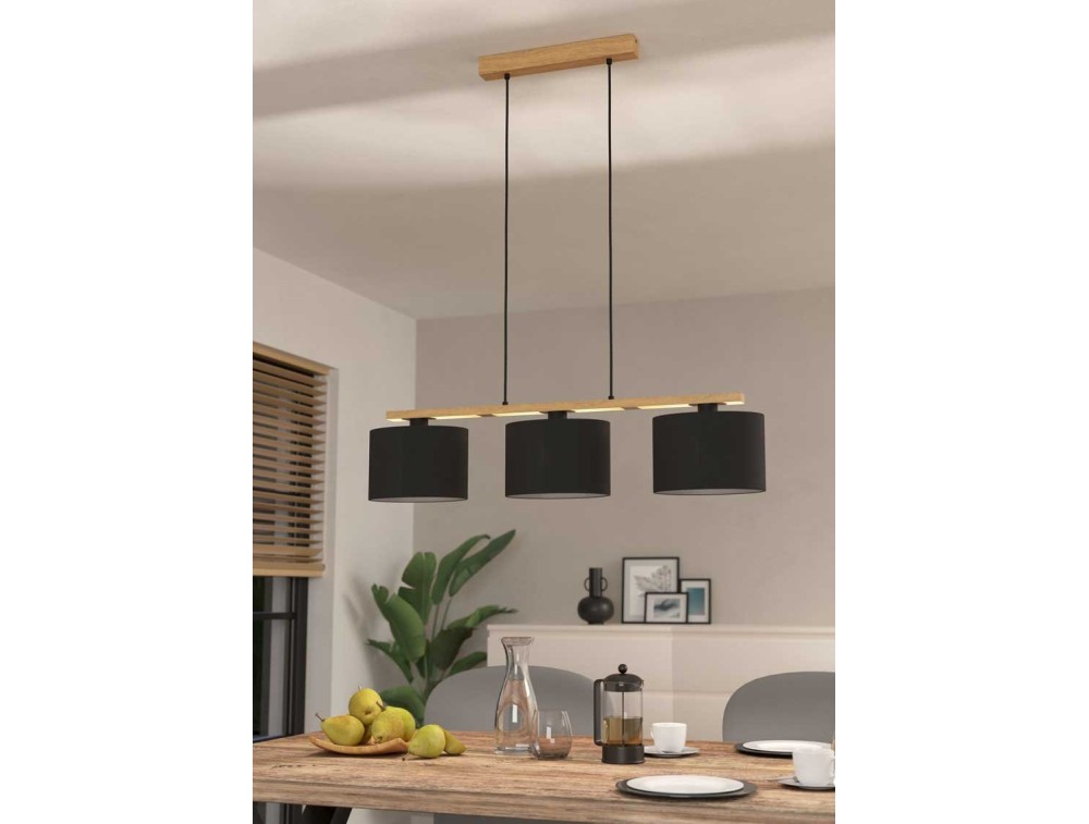 La lampada a sospensione CASTRALVO è composta struttura in legno da fissare al soffitto e da un da una piccola trave in legno corredata di tre paralumi ovali di tessuto nero.