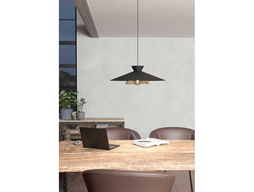 Lampadario ideale per una cucina o soggiorno di medie dimensioni in acciaio nero ed ottone.
