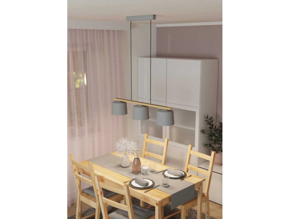 La lampada a sospensione MARIEL è composta da un rosone in metallo grigio chiaro, dal quale è sospesa una staffa in legno marrone con tre paralumi rotondi in tessuto grigio chiaro.