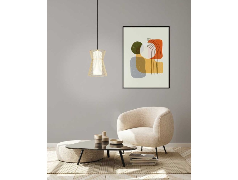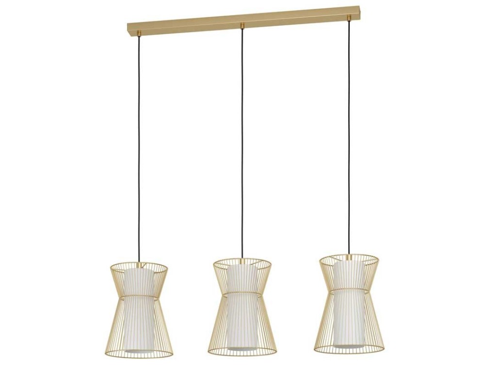 La lampada a sospensione MASETA è composta da tre paralumi in reticolato a forma di clessidra color oro o nero e un cilindro interno in vetro bianco. I paralumi in reticolato creano un affascinante gioco di luci e ombre nell'ambiente.