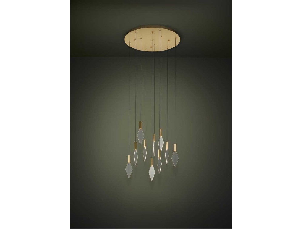 Lampadario di design moderno che trasmette eleganza e prestigio dove viene collocato, realizzato in acciaio ottone ed oro. Led integrato di ultima generazione dimmerabile.