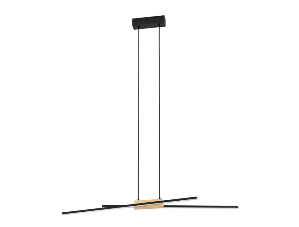 La plafoniera a LED PANAGRIA unisce metallo nero e legno naturale in un elegante design rovere. Due sottili profili LED neri, disposti in modo sfalsato, sono fissati su una piccola base di legno.