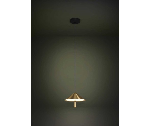 Lampadario in acciaio nero ed ottone spazzolato, ideale per una cucina, un soggiorno o una sala da pranzo. Led integrato di ultima generazione dimmerabile.