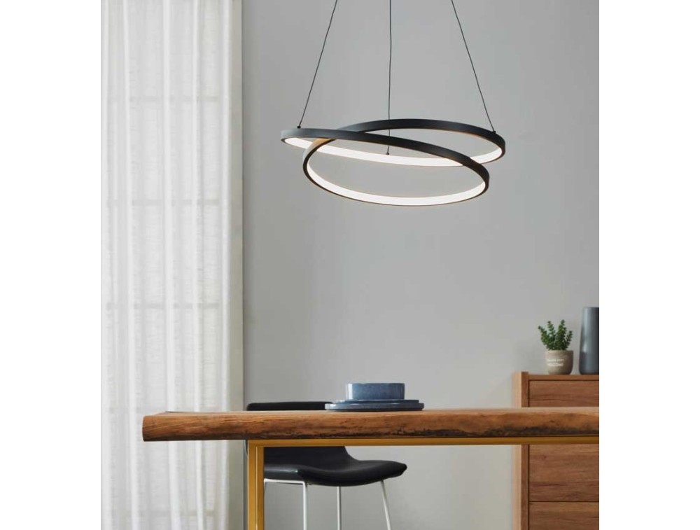 Lampadario ideale per una cucina o un soggiorno di medie dimensioni con struttura in alluminio nero e policarbonato bianco da dove fuoriesce la luce led.