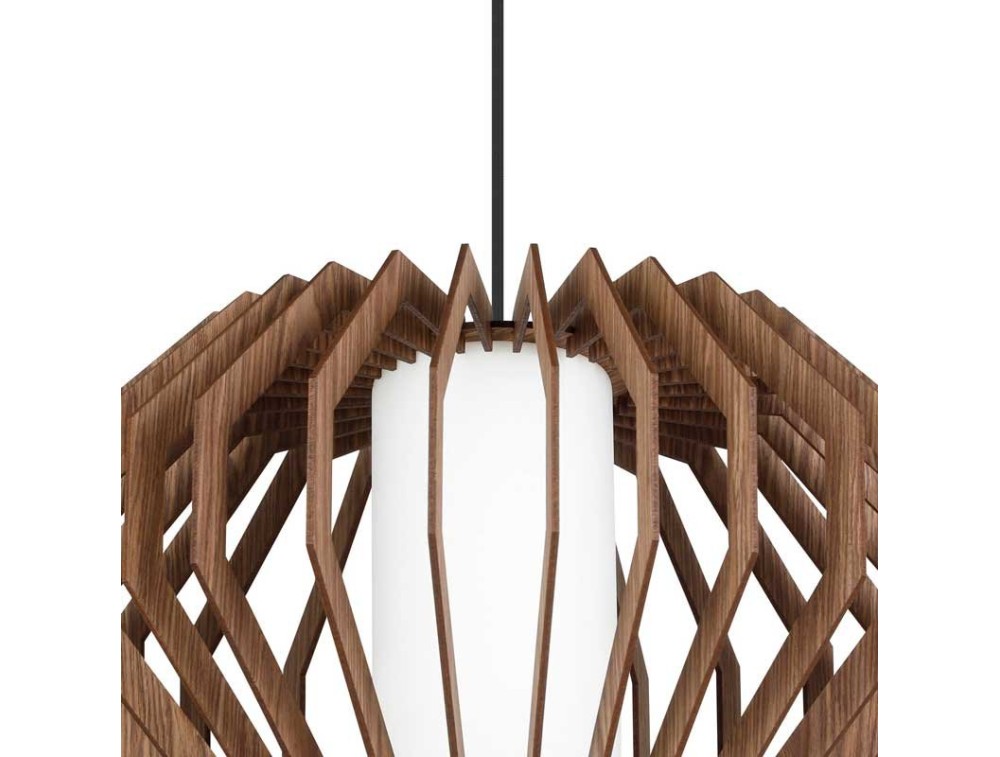 La lampada a sospensione RUSTICARIA è realizzata con un paralume in lamelle di legno marrone, sospeso con un cavo in tessuto nero a un rosone metallico dello stesso colore.