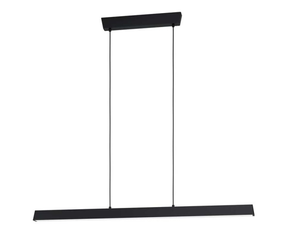 La lampada a sospensione a LED SIMOLARIS-Z, dell'assortimento Smart Home connect.Z, è composta da una corpo in metallo nero lungo 122 cm con superficie luminosa in plastica bianca opaca che scende da una base in metallo nero.