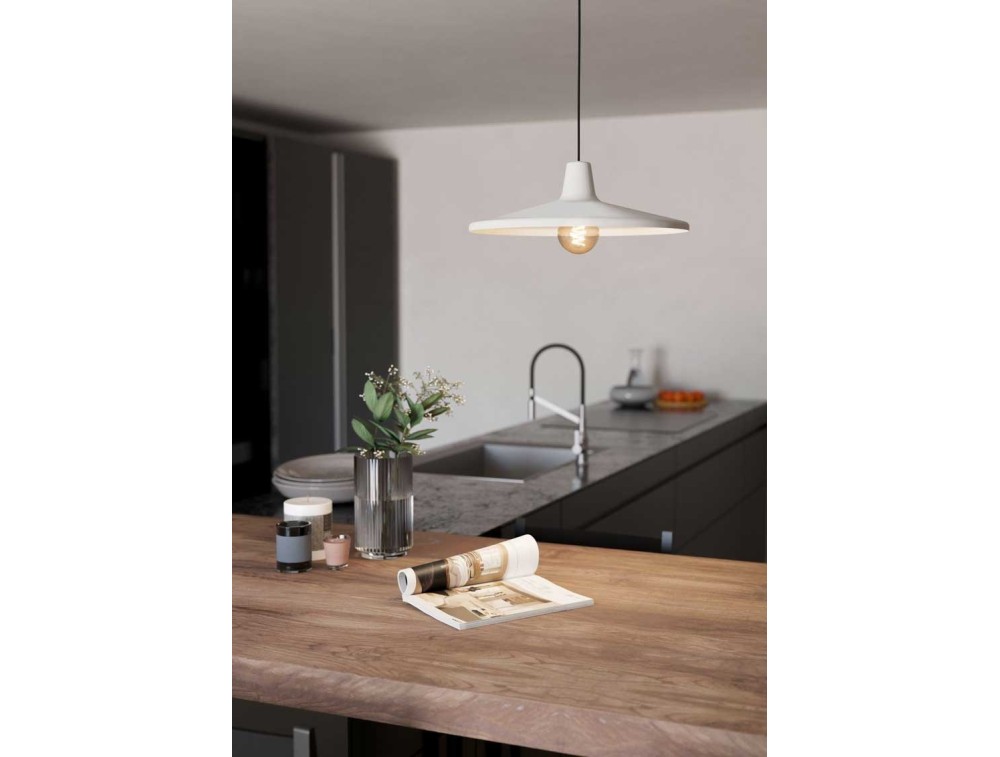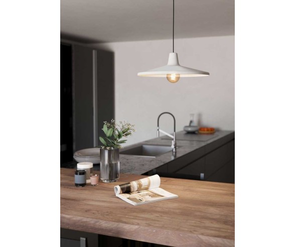 Lampadario moderno dal design semplice con struttura in acciaio nero e diffusore grigio chiaro. Lampadina E27 intercambiabile in ogni momento.