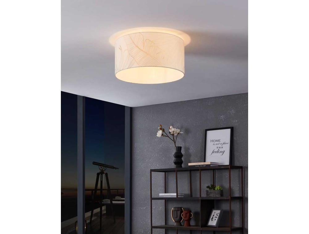 Plafoniera in tessuto bianco con decori in oro. Lampada da soffitto molto luminosa con porta lampada E27 dove è possibile scegliere a proprio piacimento la lampadina ideale per il proprio ambiente.