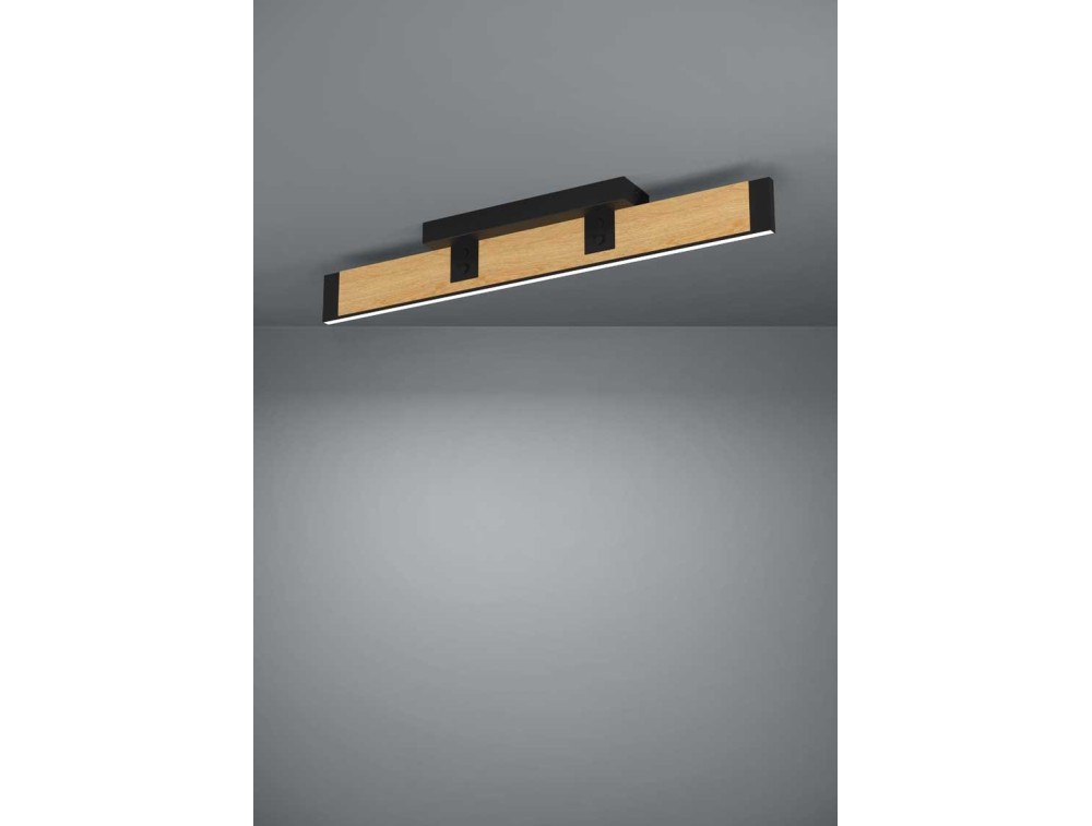 La plafoniera a LED CAMINARRO è composta da un supporto a soffitto rettangolare di colore nero, abbinato a un elemento in legno di colore naturale con LED integrati.