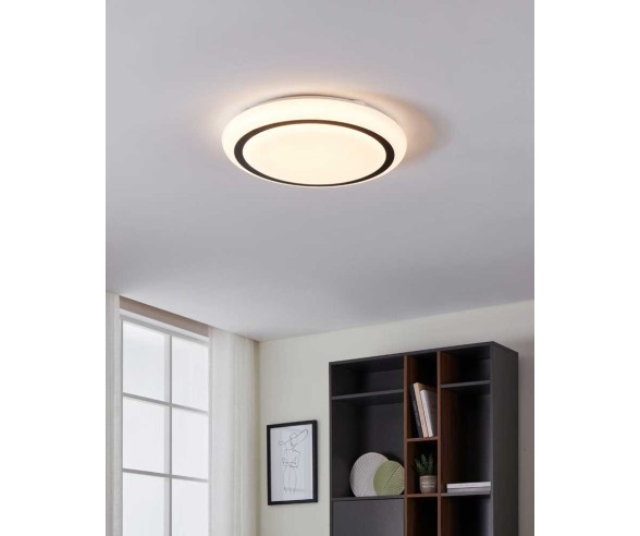 Plafoniera con diffusore in policarbonato bianco da dove fuoriesce la luce led e decoro in acciaio nero. Led integrato 3000k luce bianco caldo di ultima generazione.