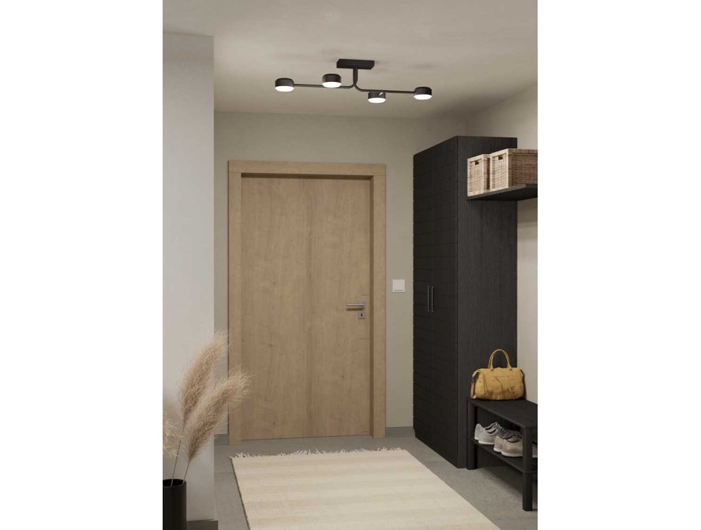 La plafoniera CLAVELLINA a LED è costituita da una base in metallo nero con rami in metallo e quattro teste luminose rotonde in metallo nero. I LED integrati, posti dietro alla superficie in acrilico bianco, diffondono una luce calda e accogliente. Con il suo design caratteristico, è ideale per il soggiorno, lo studio o la cameretta.