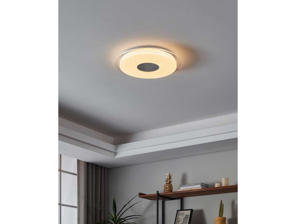 La plafoniera a LED LANCIANO-Z fa parte dell'assortimento Smart Home connect.Z ed è composta da una copertura in plastica bianca. Con la luce accesa si crea un effetto stellato e scintillante. Al centro della lampada sono stati apportati un anello in plastica trasparente e un’applicazione color cromo.