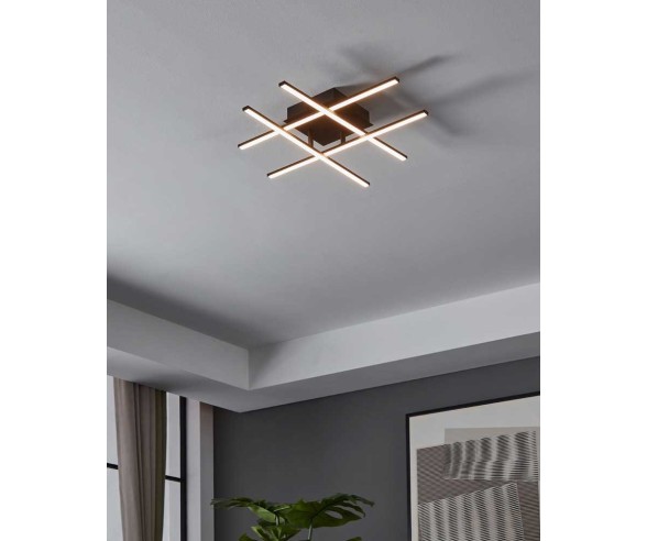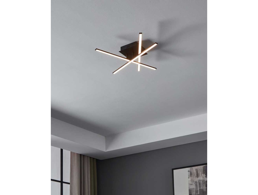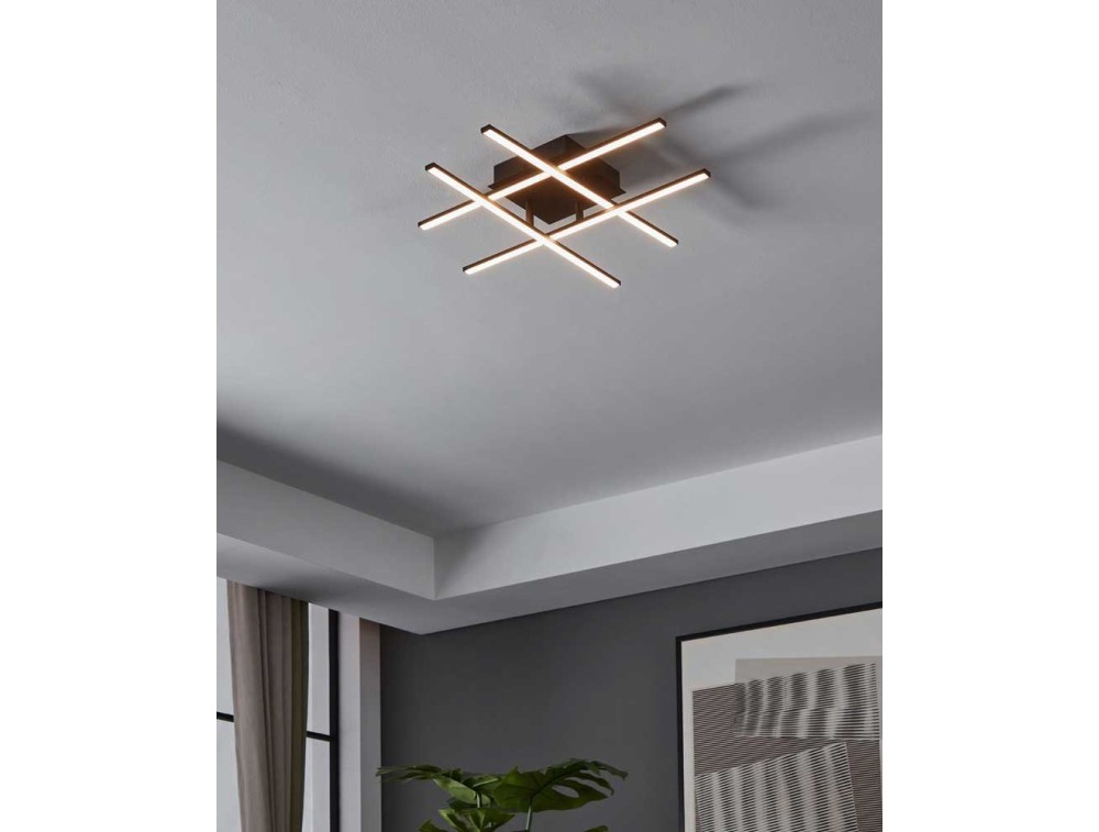 La plafoniera a LED LASANA 3 è realizzata in metallo nero con tre profili a LED diritti incrociati tra loro. I LED integrati al di sotto dei plafoni in plastica bianca emanano una luce bianca piacevolmente calda e non sono visibili.
