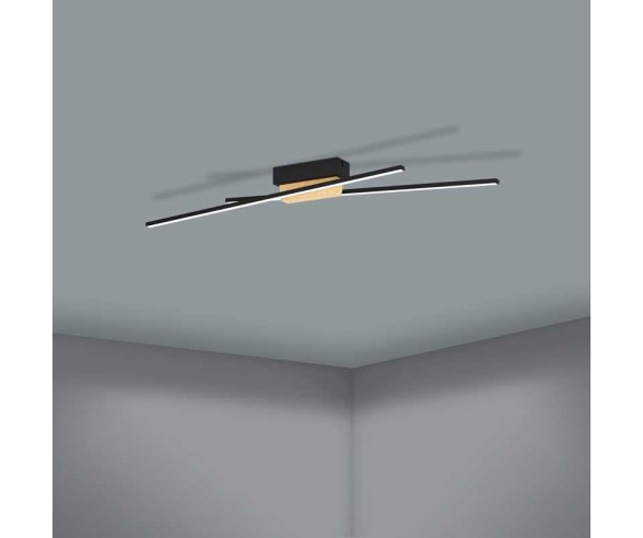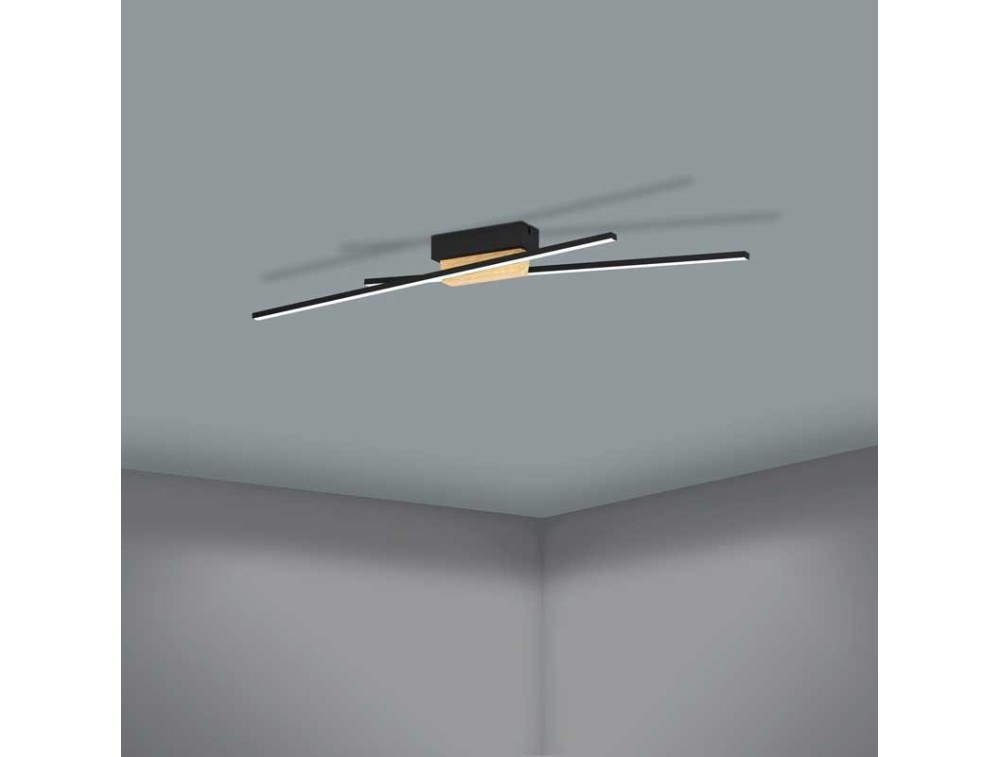 La plafoniera a LED PANAGRIA unisce metallo nero e legno naturale in un elegante design rovere. Due sottili profili LED neri, disposti in modo sfalsato, sono fissati su una piccola base di legno.