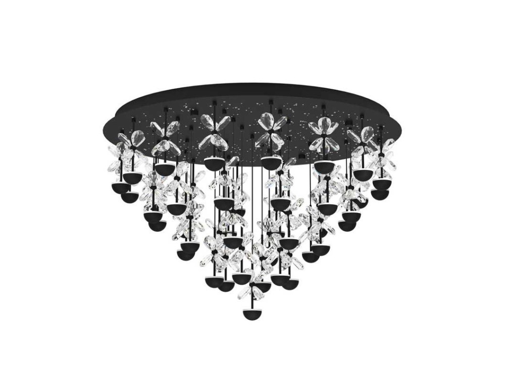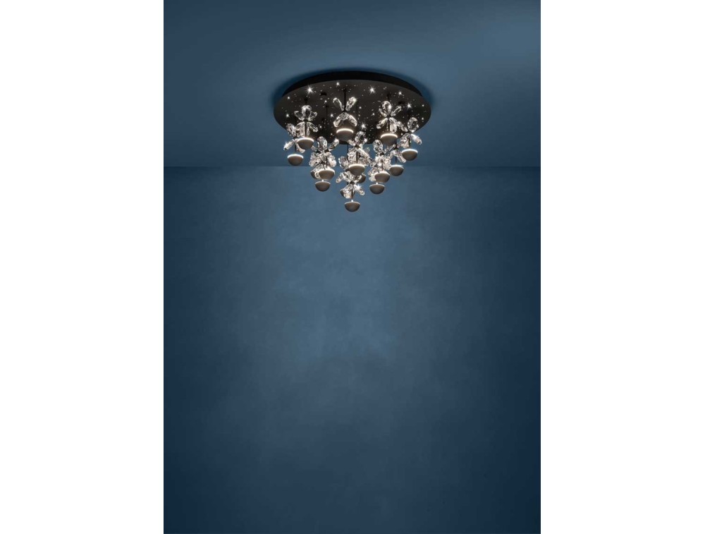 Plafoniera da soffitto con led integrato luce bianco caldo, struttura in acciaio nero ed elementi in cristallo