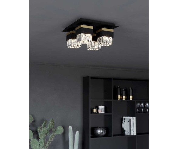La plafoniera BARRANCAS è costituita da un corpo quadrato e quattro cubi in metallo nero. I dettagli dorati e i cristalli di vetro trasparente donano alla lampada un aspetto prezioso.