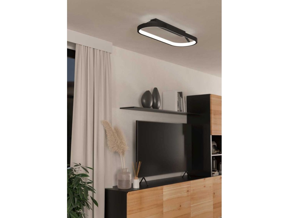 La plafoniera a LED CODRIALES è composta da un corpo in metallo nero ellittico con un profilo a LED interno in plastica bianca. I LED integrati emettono una luce bianca calda e indiretta, regolabile tramite un dimmer rotativo a parete.