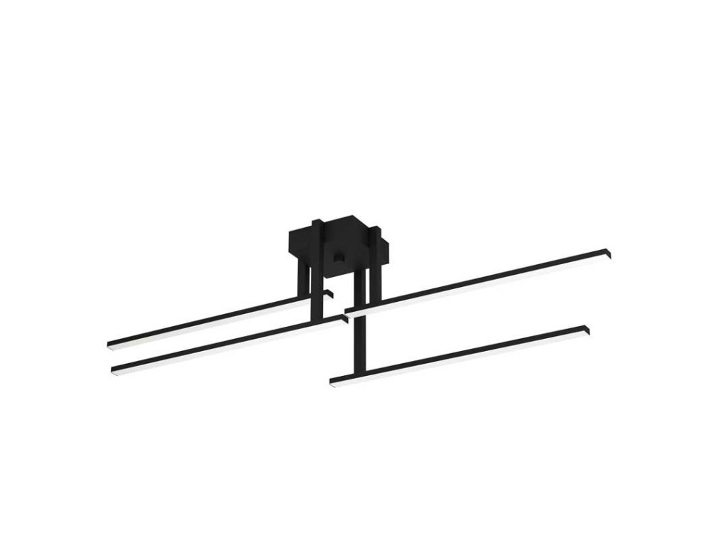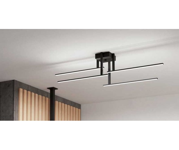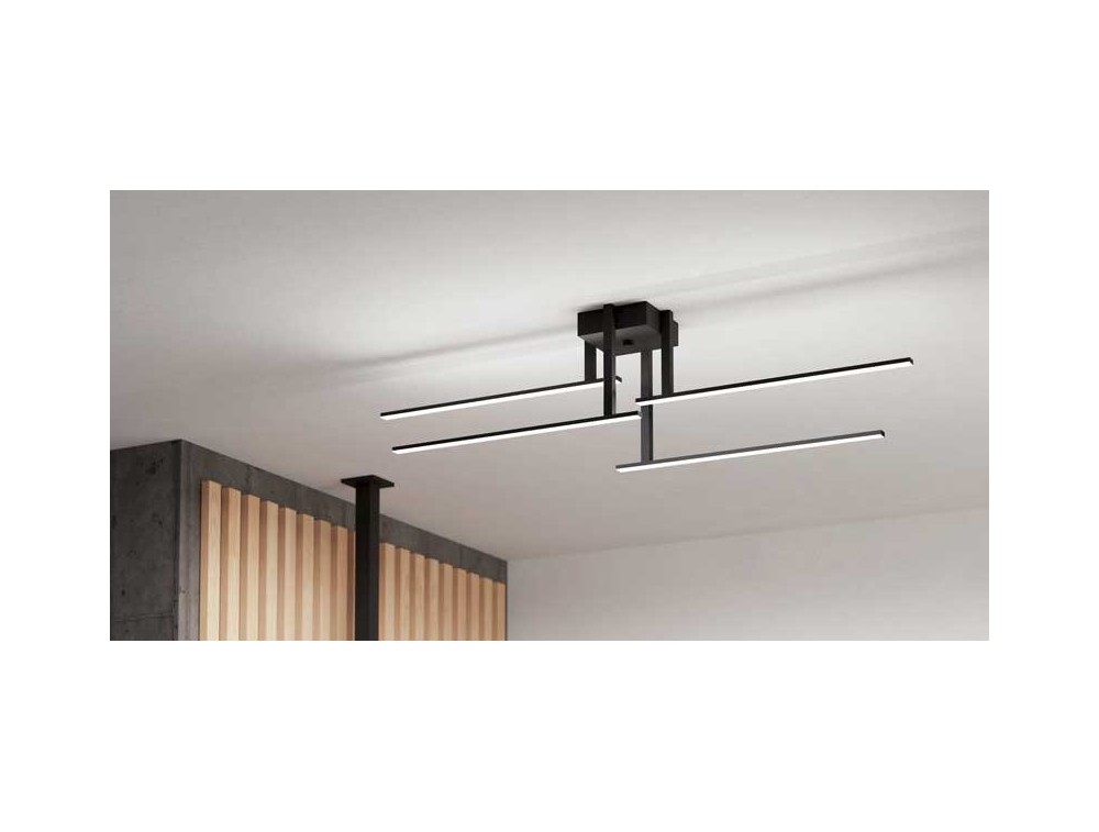 La plafoniera IPOLITTO è realizzata in metallo nero con quattro profili a LED diritti. I LED integrati al di sotto dei plafoni in plastica bianca emanano una luce bianca piacevolmente calda.