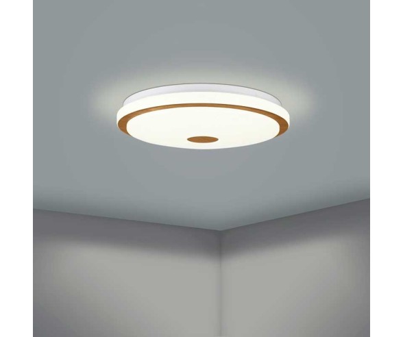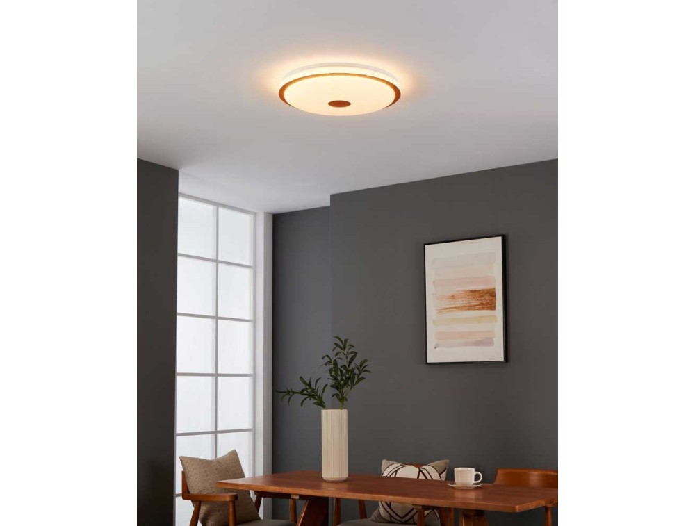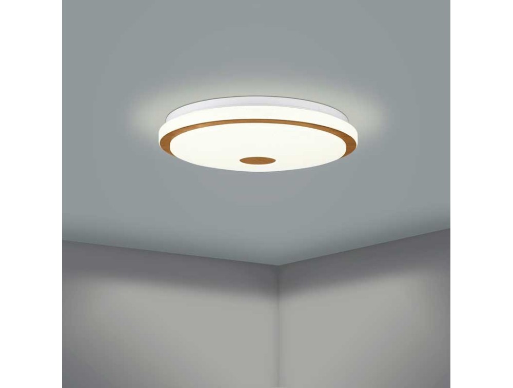 Plafoniera da soffitto in policarbonato bianco con effetto cristallo e decoro marrone in legno. Telecomando incluso con funzione dimmerabile.
