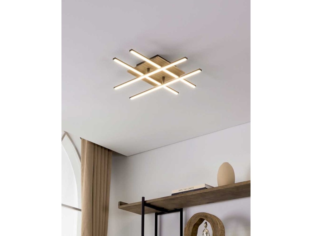 La plafoniera a LED MARINELLO 1 è composta da una piastra in legno di pino e dei profili in metallo nero su cui sono applicati i plafoni bianchi. I LED integrati emanano una luce bianca piacevolmente calda e non sono visibili