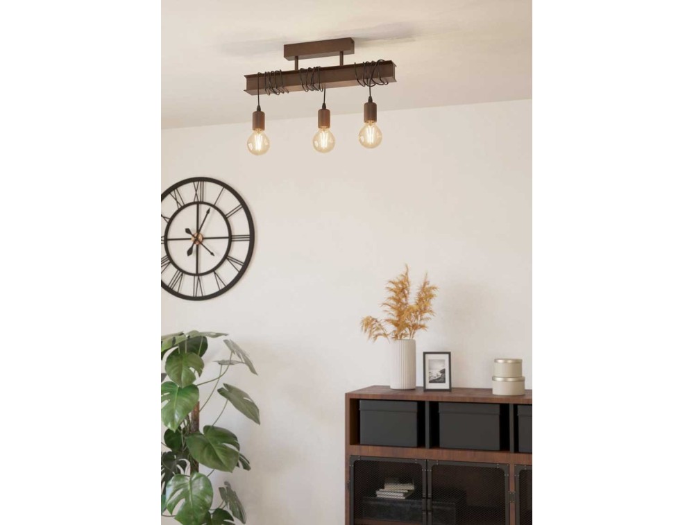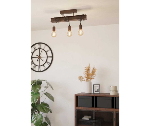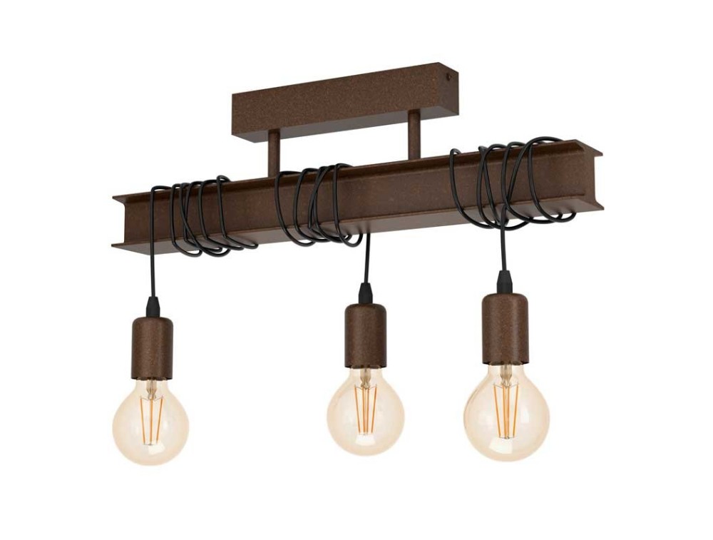La plafoniera TOWNSHEND 4 è composta da una trave in metallo in marrone antico con tre supporti pendenti per lampadine. La lunghezza di questi supporti è variabile e può essere regolata a seconda dei propri gusti.