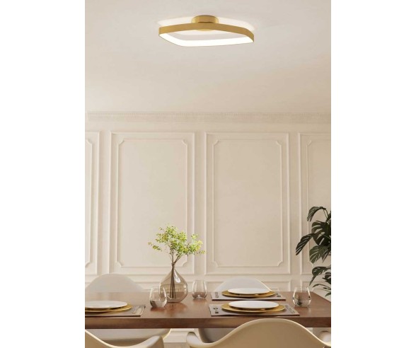 Plafoniera in alluminio e metallo di color ottone spazzolato, con diffusore in policarbonato bianco da dove fuoriesce la luce.