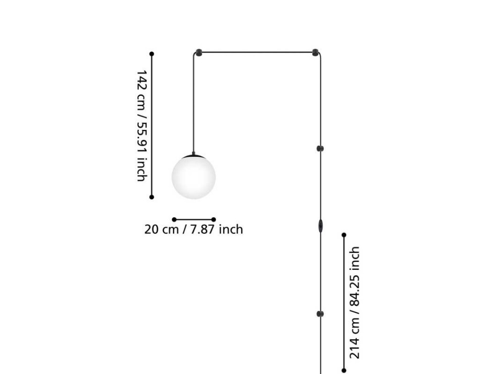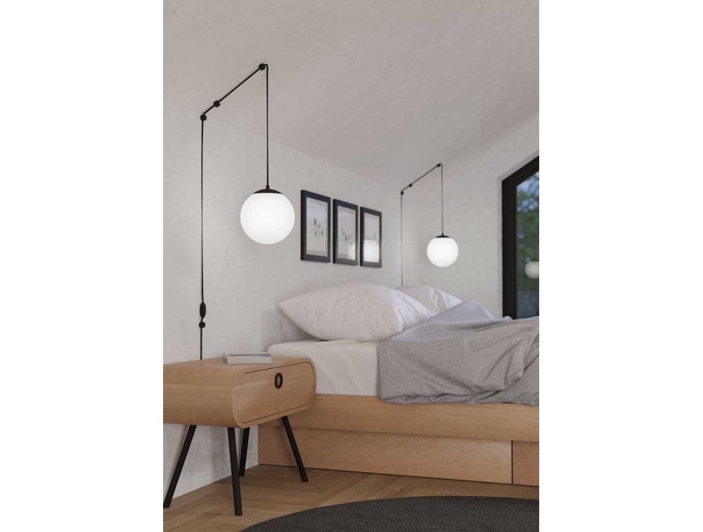 Sospensione in acciaio nero con diffusore in vetro opale opaco. Lampada dal design semplice e moderno per illuminare una camera da letto.