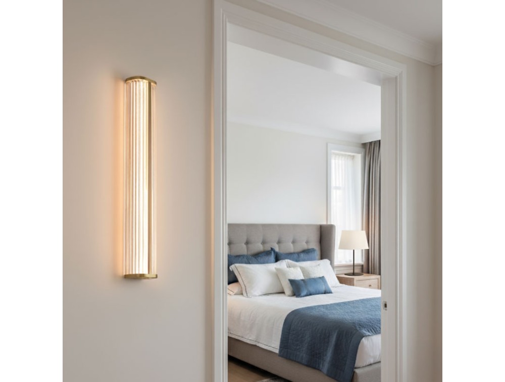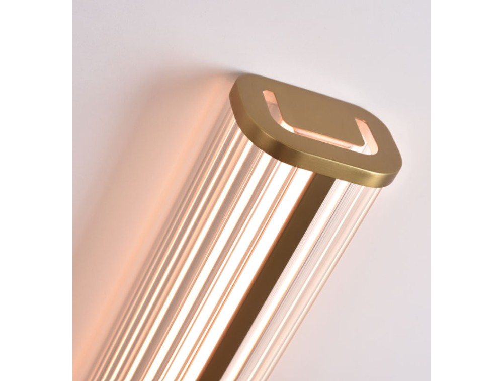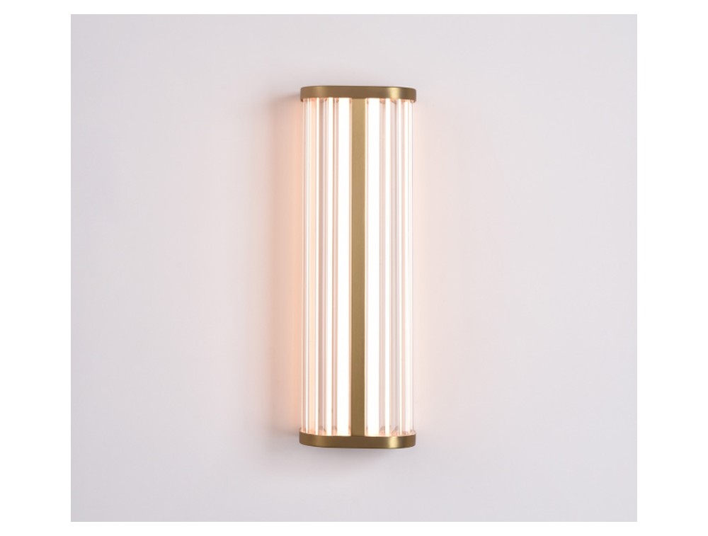 Applique realizzata in alluminio e vetro nella finitura oro con led integrato e protezione IP44. Disponibile in 3 misure cosi da adeguarsi ad ogni tipo di esigenza. Un connubio perfetto tra lo stile Art Déco e il minimalismo contemporaneo. Sono perfette installate verticalmente ai lati di uno specchio per un'illuminazione del viso uniforme e senza ombre dure. Possono essere disposte ad altezze diverse per trasformare una parete anonima in un'installazione luminosa di design. Utilizzate in versione corta come luci da lettura alternative alle classiche abat-jour.