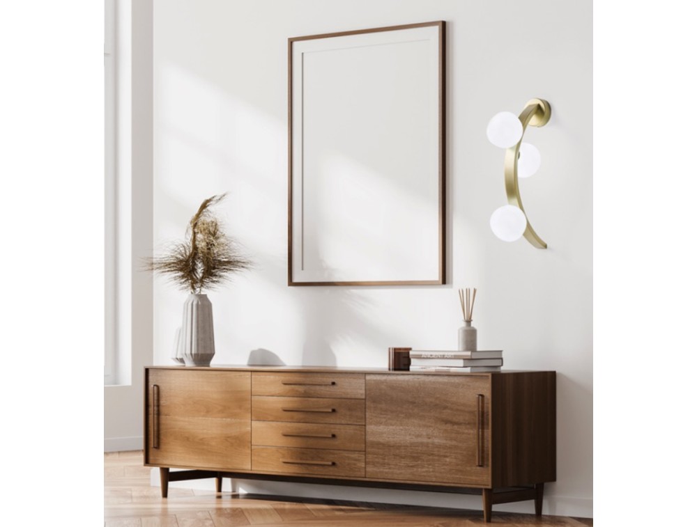 Applique realizzata in alluminio con diffusori in vetro satinato. Una combinazione di design sofisticato e comfort luminoso in grado di trasformare il tuo spazio in un ambiente unico e suggestivo. Questa applique è un perfetto esempio di stile Mid-Century Modern rivisitato, dove l'eleganza dell'ottone incontra la purezza del vetro opale in una forma dinamica e scultorea. Sta benissimo in un ingresso, ai lati di uno specchio importante, o in un soggiorno sopra una poltrona da lettura. Si sposa meravigliosamente con colori scuri (blu balena, verde bosco) che fanno risaltare l'oro, oppure con toni neutri e materiali naturali come il velluto o il noce canaletto.