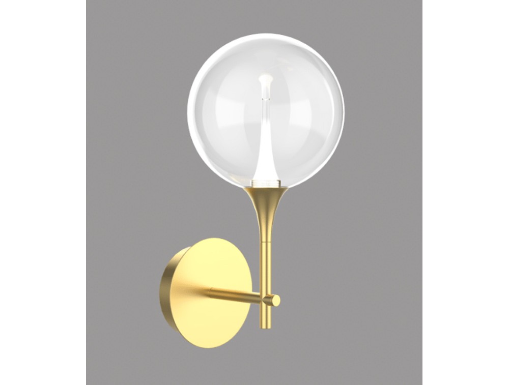 Applique con sfera in vetro soffiato e base in metallo. Disponibile nero opaco con vetro fumee o trasparente e oro satinato con vetro trasparente o ambra. Protezione IP20.