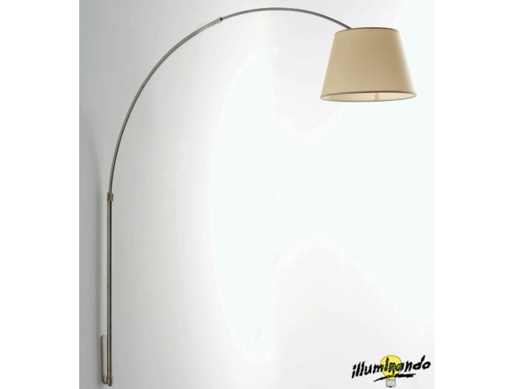 Montatura nichel spazzolata con paralume in pergamena avorio. Questa lampada è un classico esempio di lampada ad arco, un pezzo di design iconico che unisce funzionalità e una forte presenza scenica. Si sposa perfettamente con arredamenti contemporanei o neo-classici, grazie all'equilibrio tra il metallo moderno e il tessuto tradizionale del paralume.