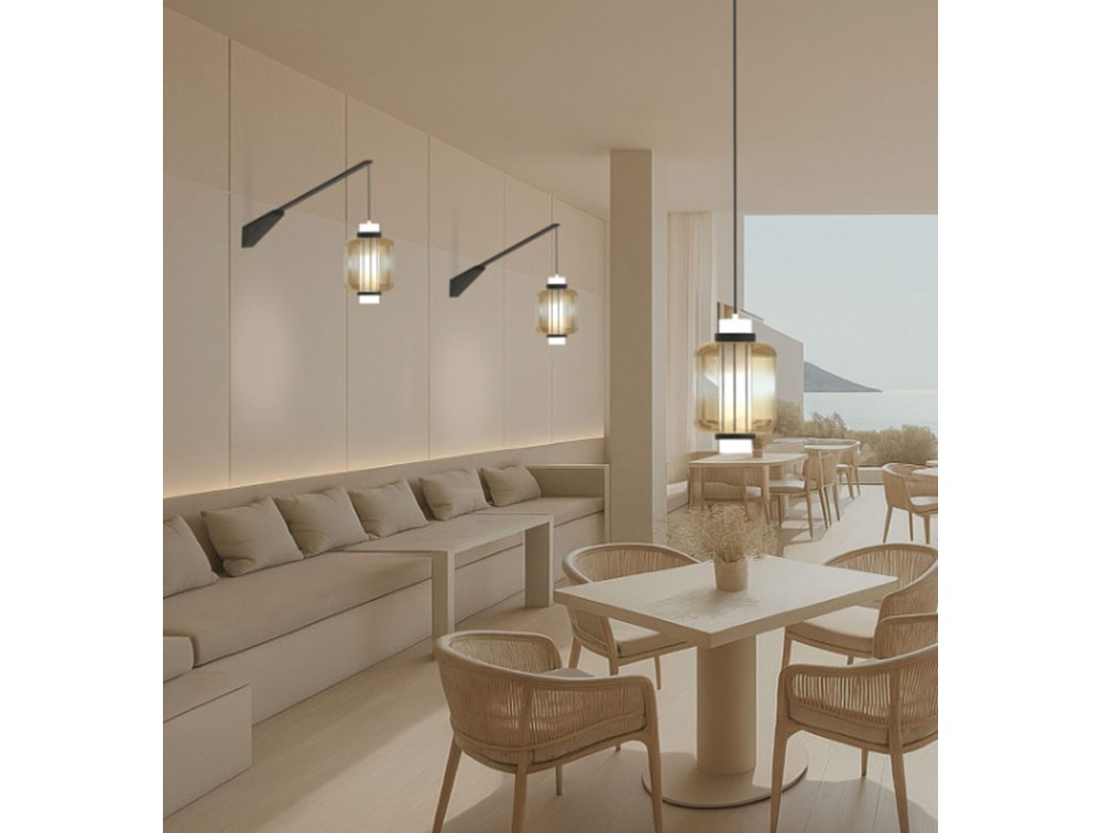 La lampada Yoko è composta da una struttura in metallo verniciato, che sostiene un tubo in vetro satinato. Il componente decorativo è realizzato in vetro borosilicato, disponibile nelle finiture ambra, cristallo, fumè e verde, con una decorazione sfumata verso il centro, che rimane trasparente. Tale effetto decorativo è ottenuto tramite una lavorazione artigianale complessa che richiede esperienza e precisione. Il montaggio della lampada è facilitato dalla possibilità di installare i componenti in vetro dopo l’installazione della struttura, rendendo anche la manutenzione più semplice.