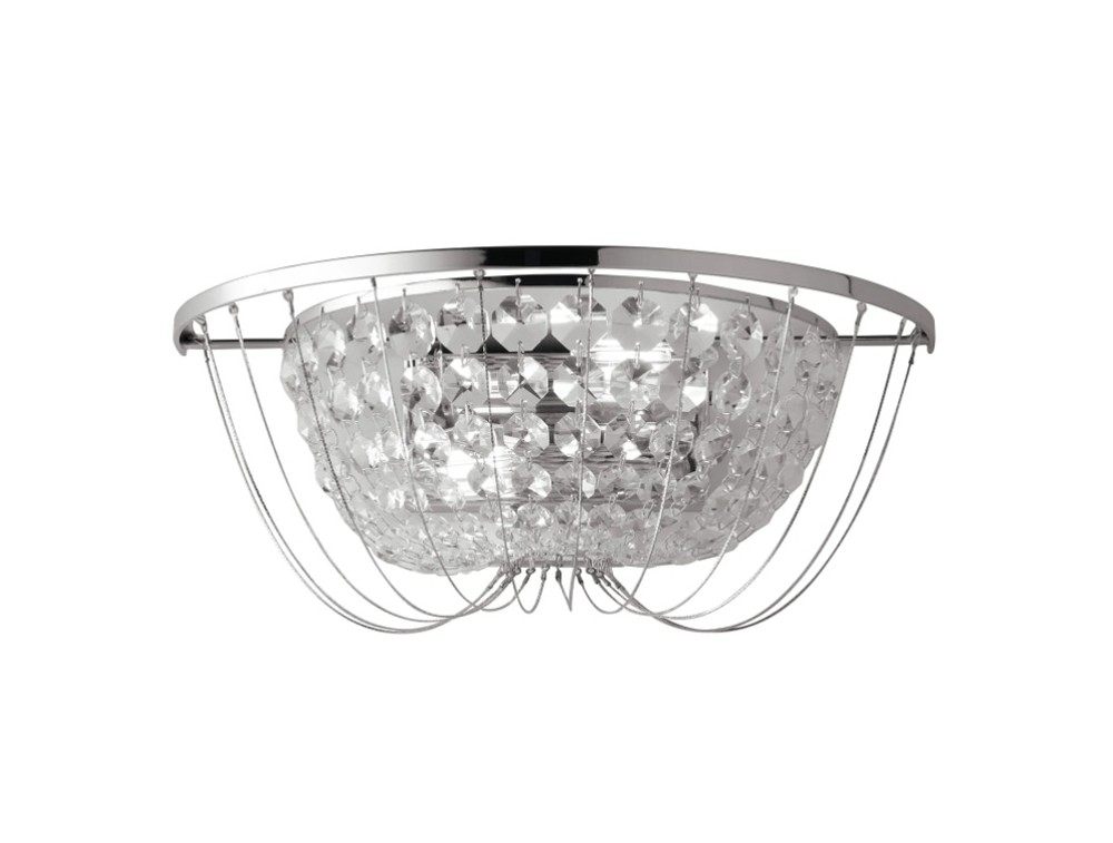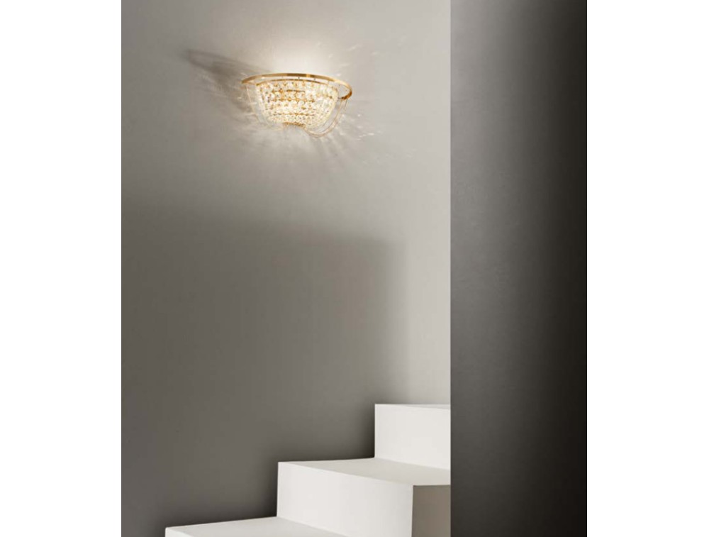 Applique caratterizzata da una particolare lavorazione in cristalli K9, disponibile con struttura in metallo dorato o cromato. Ideale per illuminare e arredare cucina, salotto e camera da letto.