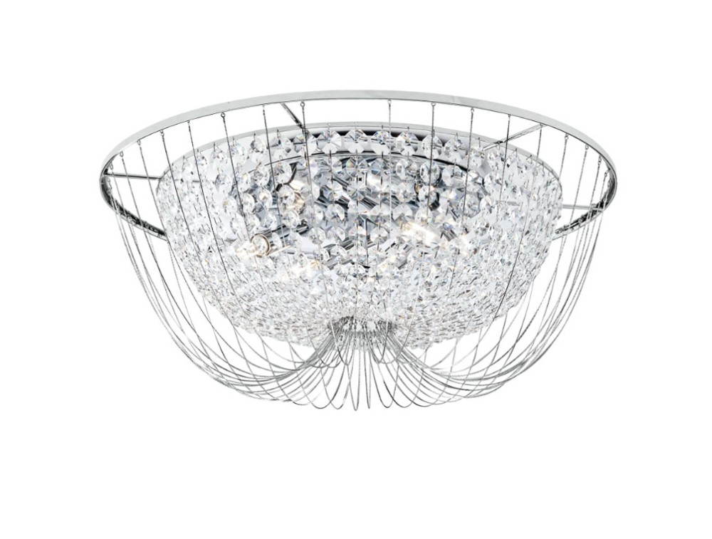 Plafoniera caratterizzata da una particolare lavorazione in cristalli K9, disponibile con struttura in metallo dorato o cromato. Ideale per illuminare e arredare cucina, salotto e camera da letto.