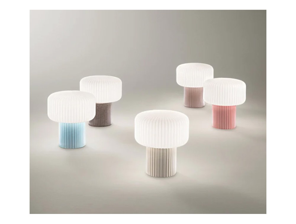 Caratterizzata da una struttura in ceramica plissettata, disponibile nei colori: blu, marrone scuro, grigio chiaro, rosa e tortora. Il diffusore è realizzato in vetro soffiato bianco, con finitura plissettata e acidata, per una luce morbida e gradevole. Garantisce semplicità di utilizzo e facile sostituzione della sorgente luminosa.