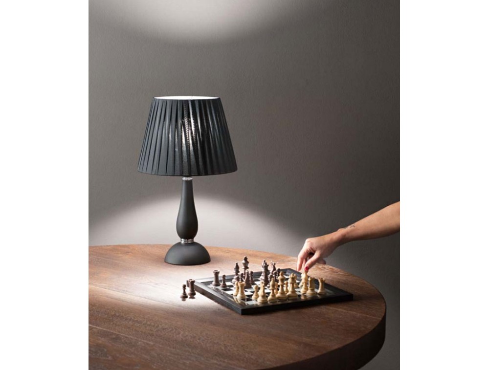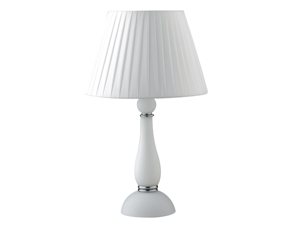 Lampada da tavolo in vetro soffiato disponibile nella versione nero o bianco satinato con finiture cromo. Perfetta per arredare e illuminare cucina, salotto e camera da letto.