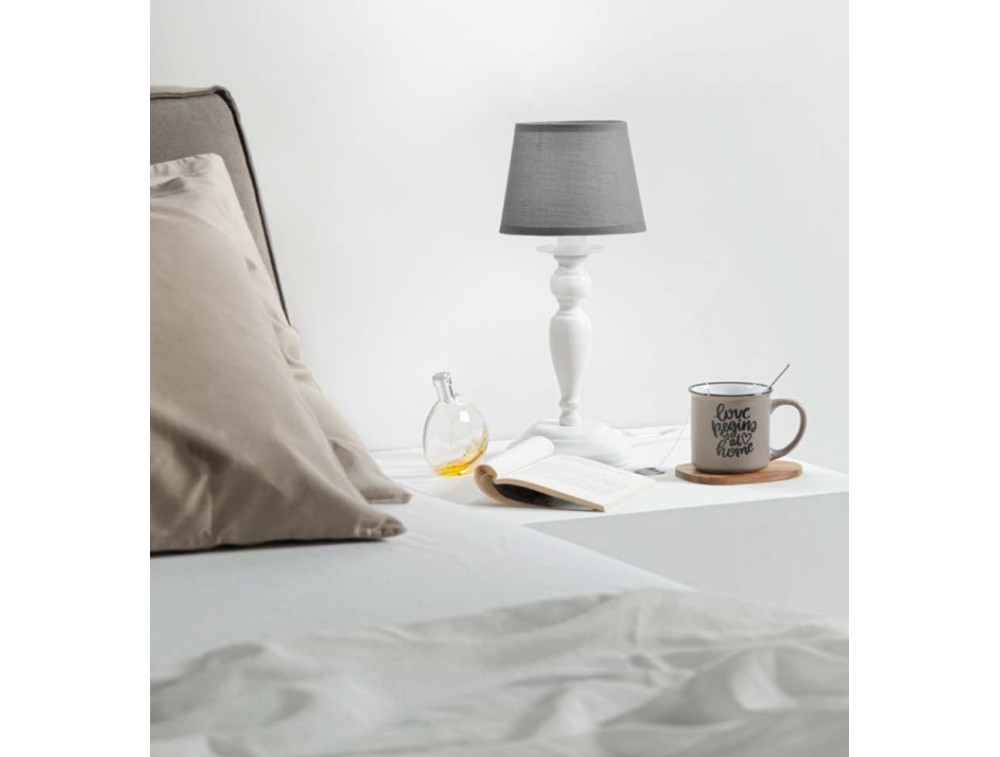 Lampada da tavolo in metallo bianco e paralumi in tessuto grigio. Per cucina, salotto e camera da letto.