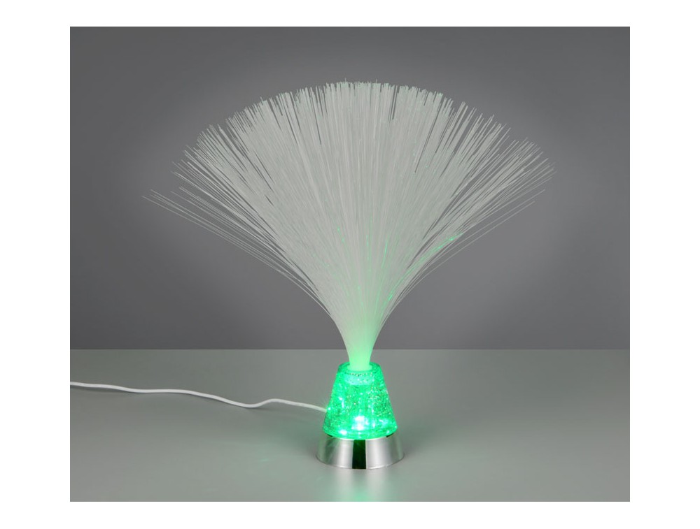 Lampada da tavolo realizzata in plastica color cromo con led RGB che permette di cambiare colore in ogni occasione. Dotata di interruttore per spegnere e accendere la lampada. Garanzia sui led di 5 anni e protezione IP2O. Inoltre può essere alimentata anche a pile.