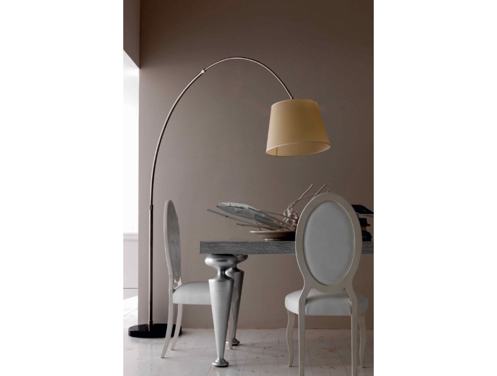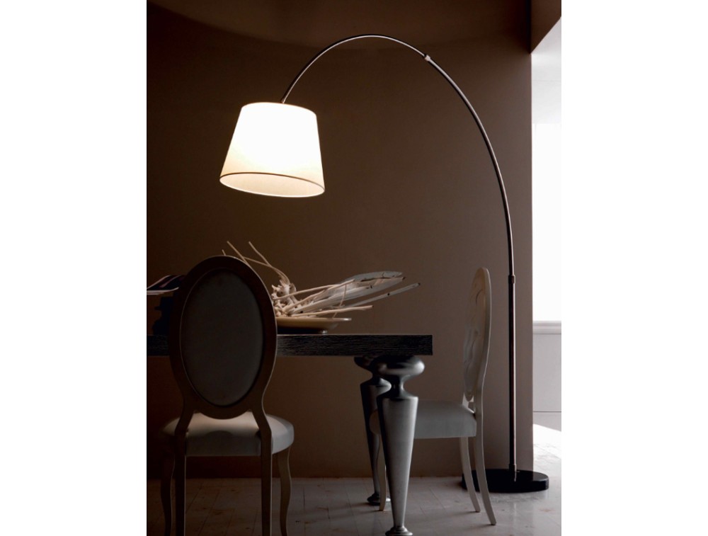 Montatura nichel spazzolata con paralume in pergamena avorio, a richiesta bianco e base in marmo nero. Questa lampada da terra è un classico esempio di lampada ad arco, un pezzo di design iconico che unisce funzionalità e una forte presenza scenica. Si sposa perfettamente con arredamenti contemporanei o neo-classici, grazie all'equilibrio tra il metallo moderno e il tessuto tradizionale del paralume.