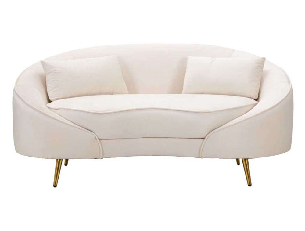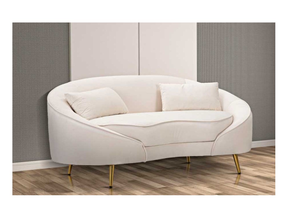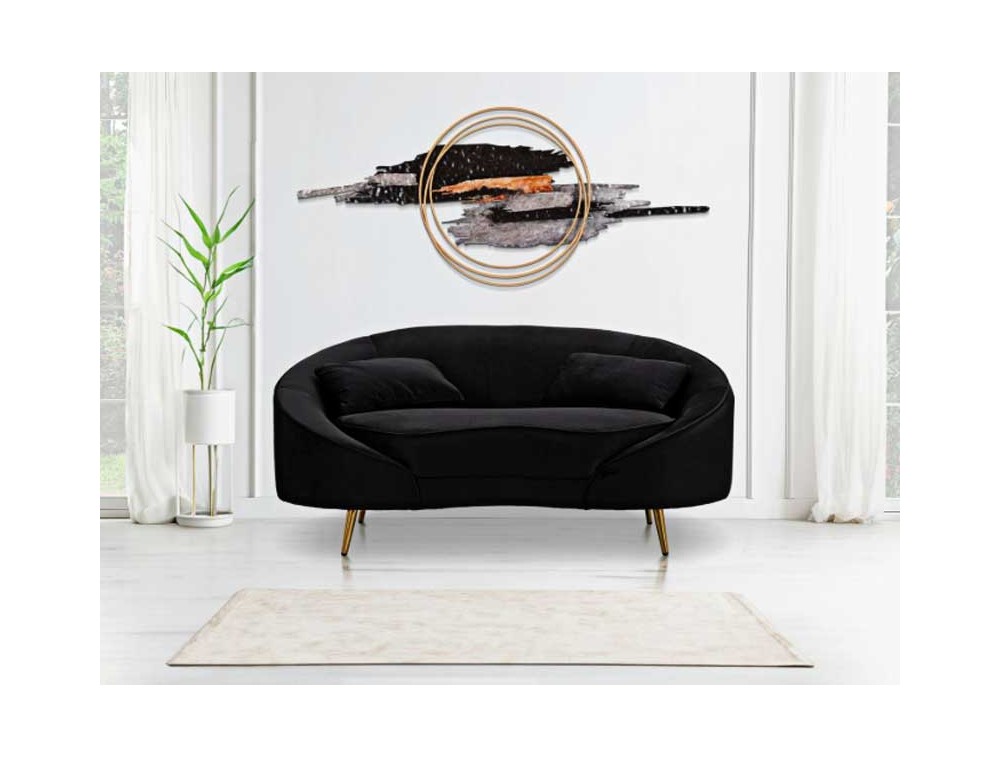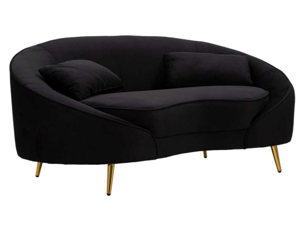 Divanetto 2 posti in tessuto imbottito nero o crema dalle linee morbide e avvolgenti, le gambe in metallo dorato donano un tocco di classe e luminosità. Completo di 2 cuscini. Realizzato in legno di eucalipto, spugna e poliestere.