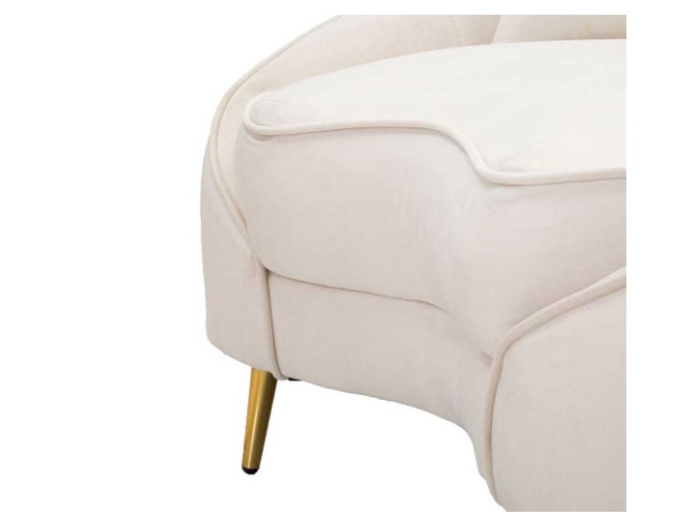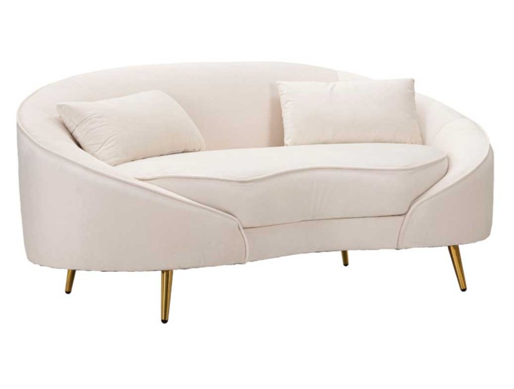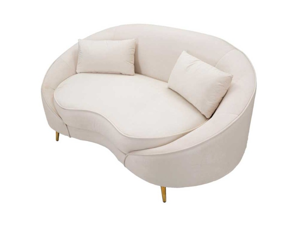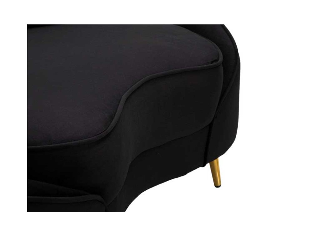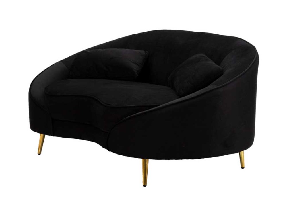 Divanetto 2 posti in tessuto imbottito nero o crema dalle linee morbide e avvolgenti, le gambe in metallo dorato donano un tocco di classe e luminosità. Completo di 2 cuscini. Realizzato in legno di eucalipto, spugna e poliestere.