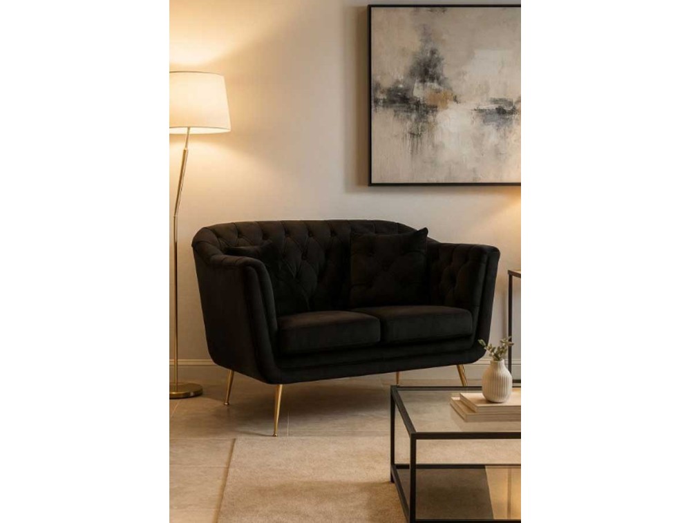 Un'eleganza sobria e luminosa prende forma nel divanetto Budapest crema. Il rivestimento chiaro e vellutato, i cuscini morbidi e la raffinata lavorazione dello schienale lo rendono ideale per ambienti che puntano su classe e armonia. Le gambe dorate aggiungono un tocco di lusso leggero e discreto. Il divanetto Budapest Nero è l’emblema di uno stile deciso e sofisticato. Il tessuto scuro, ricco di riflessi, valorizza la lavorazione capitonné donando profondità e carattere. Perfetto per spazi contemporanei, lounge di prestigio o ambienti dal forte impatto estetico. Realizzata in compensato, spugna, poliestere e ferro.